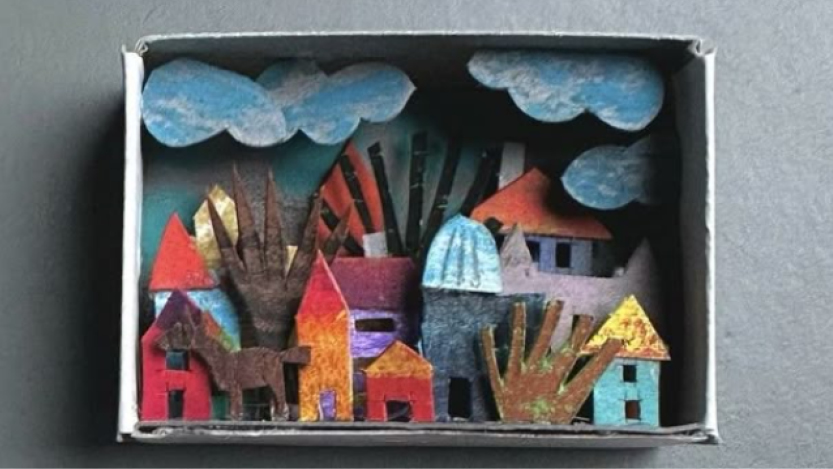 Une boîte comme un secret, un écrin pour créer un petit monde à soi à observer à travers la lucarne. Collages, dessins,