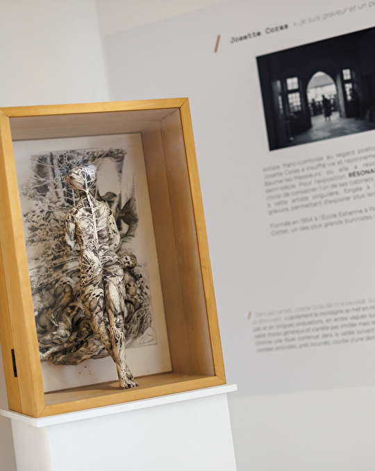 L’exposition met aussi en lumière Josette Coras (1926 – 2008), artiste franc-comtoise au regard poétique et puissant. Ses gravures, dessins et peintures font résonner les paysages et le patrimoine qui l’entouraient, offrant une lecture singulière du territoire jurassien.