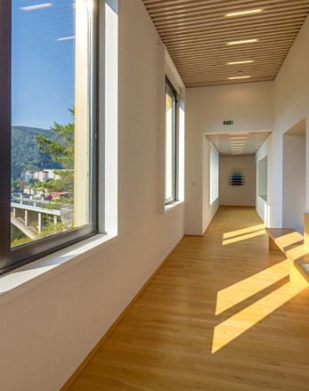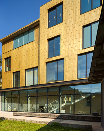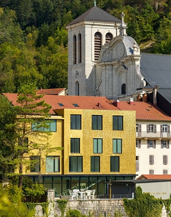 Pour habiller cette façade, l’architecte s’est inspiré d’un savoir-faire local : les tavaillons, ces petites tuiles de bois utilisées pour protéger les maisons jurassiennes des intempéries. Il a revisité cette tradition en optant pour un revêtement en alliage cuivre-aluminium.