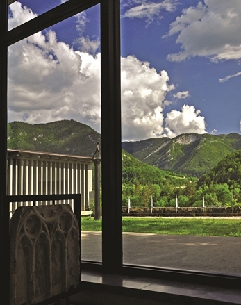 La base vitrée de la façade crée un effet de transparence : en s’approchant, les visiteurs peuvent deviner les élégantes arches en arc brisé des deux chapelles de l’ancien palais abbatial.