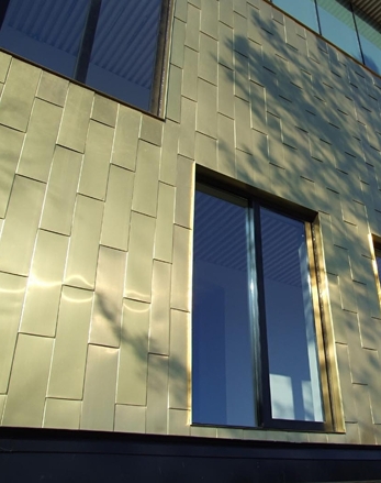 Résultat : une façade dorée, changeante, qui capte la lumière différemment selon la météo : mate sous un ciel gris, éclatante au soleil.