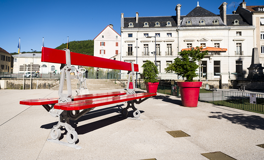 Juste à la sortie, ne manquez pas de vous arrêter devant une œuvre qui ne passe pas inaperçue : le Double Banc Rouge de Lilian Bourgeat. Ce banc géant installé sur le parvis du musée fait écho à l’univers de l’artiste, originaire de Saint-Claude, connu pour ses objets du quotidien agrandis à l’extrême. Avec humour et décalage, cette sculpture monumentale invite à poser un autre regard sur le réel… et à immortaliser le moment avec une photo souvenir !