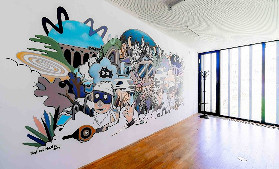 C’est aussi dans ce cadre que se trouve le pavillon pédagogique, où le musée organise régulièrement des ateliers manuels, de dessins, d'aquarelle, de vitrail, d'initiation à l'archéologie... Thomas Broquet, alias BROKOVICH a réalisé dans ce pavillon une fresque en live à l'occasion de la nuit des musées 2024.