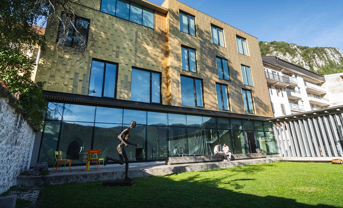 À l’arrière du musée, le jardin est un véritable espace de détente, idéal pour une pause entre les différentes sections de l'exposition. Il prolonge la visite en plein air, en mêlant nature et art contemporain : deux sculptures y sont installées et dialoguent avec les paysages du Haut-Jura. D'ici vous avez une magnifique vue sur le grand pont de Saint-Claude et les montagnes environnantes !